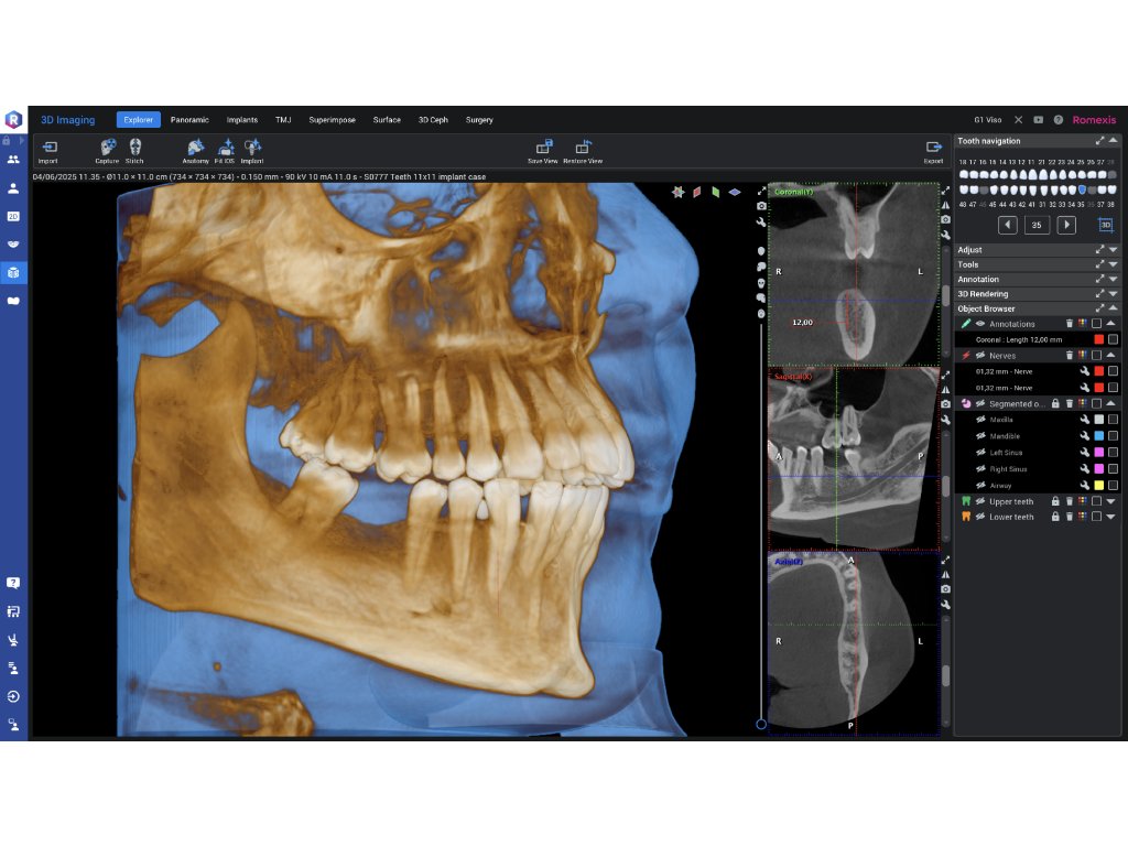 Software Romexis obsahuje řadu funkcí využívajících umělou inteligenci, které usnadňují prohlížení a zpracování CBCT snímků s menším počtem kliknutí. Romexis umožňuje automatické rozpoznání a segmentaci struktur, jako jsou zuby, nervy, čelisti, dýchací cesty a dutiny. Díky tomu je práce se softwarem rychlejší a jednodušší a zároveň nabízí vynikající vizualizaci případu pro edukaci pacienta. Pomocí umělé inteligence dochází také k automatickému propojení CBCT snímků s intraorálními skeny.